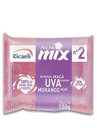 Polpa Mista de Uva, Morango, Maçã, Açaí, Beterraba e Gengibre. Ingredientes vindos das frutas e vegetais, na combinação perfeita para o equilíbrio do organismo. MINERAIS: Ácido Fólico | Cálcio | Cobre | Ferro | Fósforo | Magnésio | Manganês | Potássio | Selênio | Sódio | Zinco. VITAMINAS: A | B1 | B2 | B5 | B6 | C | D | E | K.